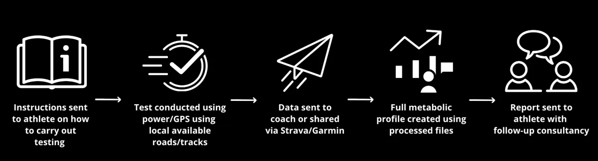 Test remotely or in the field, using a GPS watch, power meter. We'll make sure you get a full metabolic report with lab level accuracy.
